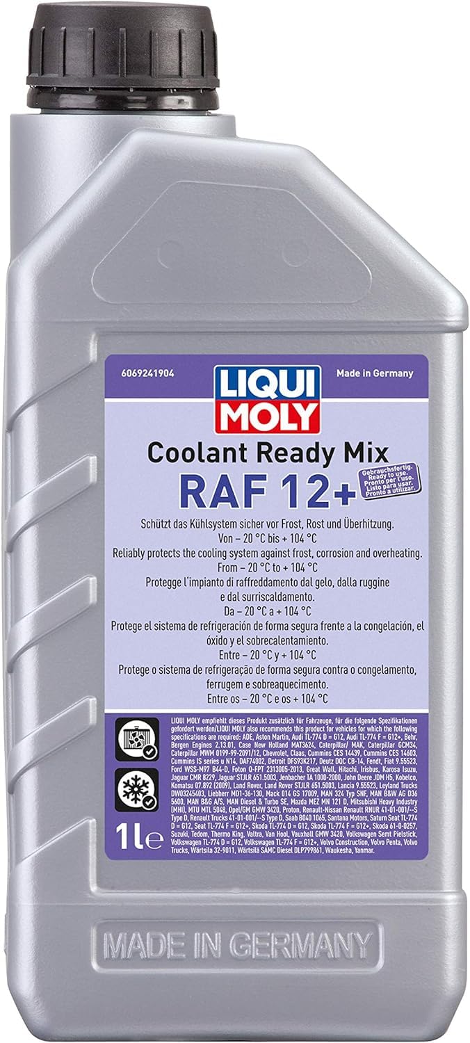 Clean the cooling system with LIQUI MOLY Radiator Cleaner (part no. 3320). Then drain it, flush it thoroughly with water and fill with ready-to-use Coolant Ready Mix RAF 12+. Disposal according to the local regulations. Change interval according to manufacturer's instructions. Coolant Ready Mix RAF 12+ is miscible and compatible with silicate-free radiator antifreeze with quality VW designation G12+ and VW specification TL 774-D/F (Radiator Antifreeze KFS 12+ from LIQUI MOLY) or with radiator antifreeze that contains silicates from the original products in accordance with the VW specification TL 774-C (Radiator Antifreeze KFS 11 and Coolant Ready Mix RAF 11 from LIQUI MOLY).